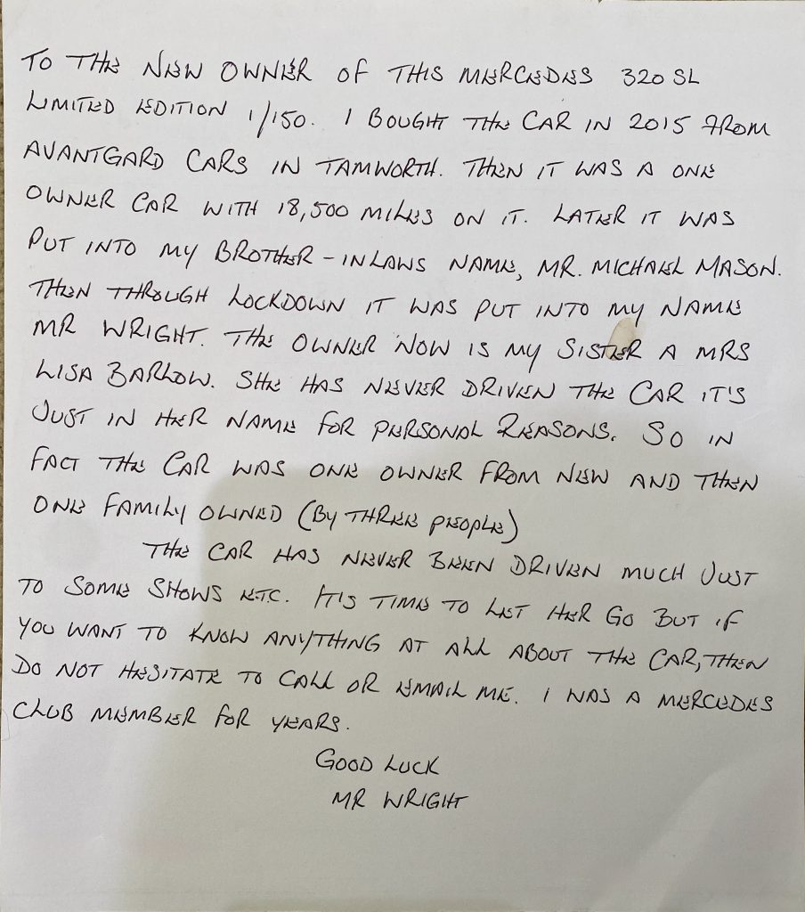 Supplied with all relevant documentation including a Full car vertical report, Leather bound wallet and book pack, 2 keys, wind deflector, build sheet, SL brochure/book and Mercedes Benz owners club literature.
